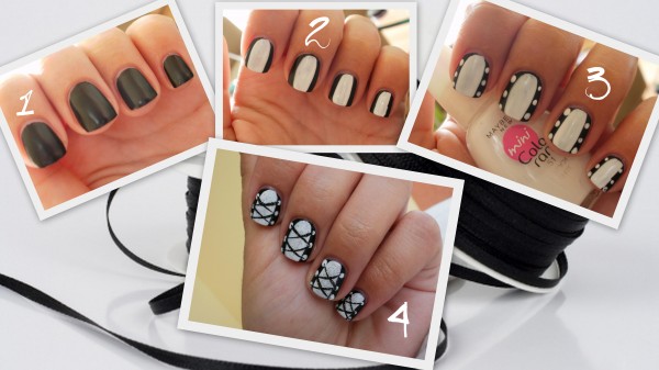 - Nakonec, pomocí tenkého štětečku a černého laku, vytvoříme šněrování. Tak, že z každého puntíku vedeme úzkou linku směrem k protějšímu puntíku "o patro níž". Bílou část designu ještě přetřeme jakýmkoli třpytivým lakem.